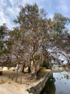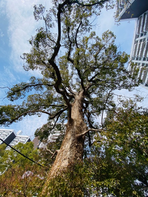 被爆樹木ガイドツアーの講師は、特別非営利活動法人ANT広島理事の渡部久仁子さん。被爆樹木は被爆の反対側は成長するため爆心地に向かって少し傾いているそうです。