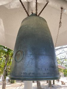 人間国宝の香取正彦氏が制作された「平和の鐘」の表面には国境のない世界地図、そして上の方には日(八咫烏)月(うさぎ)星(北斗七星)がデザインされていました。心に響く澄み渡るような音色です。