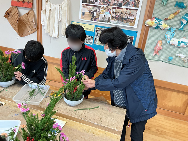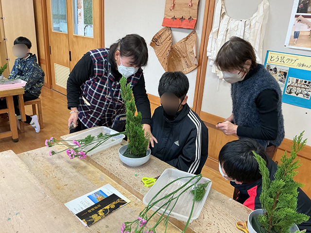 6年生社会科の文化の伝承学習からいけばな体験の依頼があり、いけばなの成り立ちから現在までを、テキストやパネルを用いて説明しました。皆興味を持って聞いてくれて、メモを取る姿も見られました。体験では貝塚伊吹の枝を用いて、森林の景に取り組みました。相のカーネーションは3色を用意し、好きな色を選ぶようにすると積極的に参加してくれました。12月だったのでクリスマスの飾りをつけると、それぞれ個性的な作品ができあがり、最後は皆で鑑賞しました。