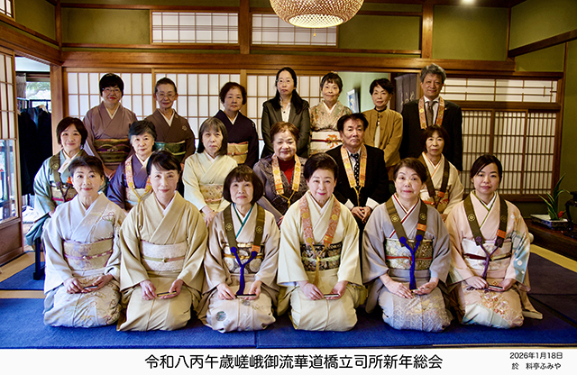 橋立司所 新年総会 2026.03.21 | いけばな通信 1月18日、宮津市料亭ふみやにて山中恵美甫先生を来賓にお迎えし、新年総会を開催しました。献華式、記念撮影、懇親会と会員一同和やかな新年を迎えました。 司所長/松本百甫