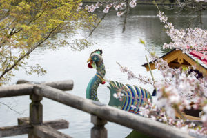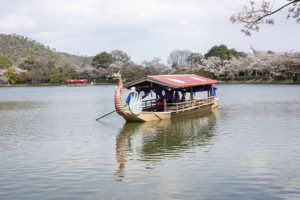 華道祭期間中は、龍頭鷁首舟に乗って大沢池を遊覧することができます。